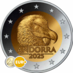 La moneda presenta un retrato detallado de la cabeza del quebrantahuesos, mirando hacia la derecha. El fondo liso enfatiza la expresión imponente. Debajo de la imagen aparecen el nombre del país, “ANDORRA”, y el año “2025”, todo ello enmarcado por el anillo de plata con las doce estrellas de la Unión Europea.
