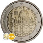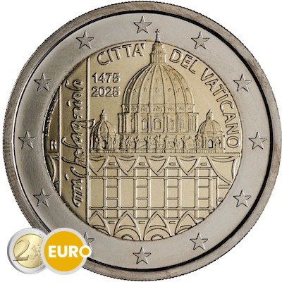 Coupole de la basilique Saint-Pierre, conçue par Michel-Ange, sur laquelle il travailla jusqu’à sa mort en 1564. En dessous figure un détail de la voûte de la chapelle Sixtine, divisée en sections par Michel-Ange et ornée de fresques dont il est l’auteur. Sur la gauche apparaissent l’occasion de l’émission « michelagniolo », le différent monétaire « R » de l’atelier de Rome et le nom de la dessinatrice « D. LONGO ». L’État émetteur « CITTÀ DEL VATICANO » est disposé en haut à droite du bord. En dessous figurent l’année de naissance de Michel-Ange « 1475 » et l’année d’émission « 2025 ».