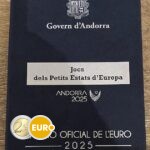 Der Münzkern zeigt verschiedene Sportelemente, darunter Bälle aus unterschiedlichen Sportarten, mit stilisierten Netzen als Hintergrund. Sie alle haben einen dynamischen Stil, der Bewegung und Energie ausstrahlt. Oben steht die Aufschrift „Jocs dels Petits Estats d’Europa“ und unten „ANDORRA 2025“.