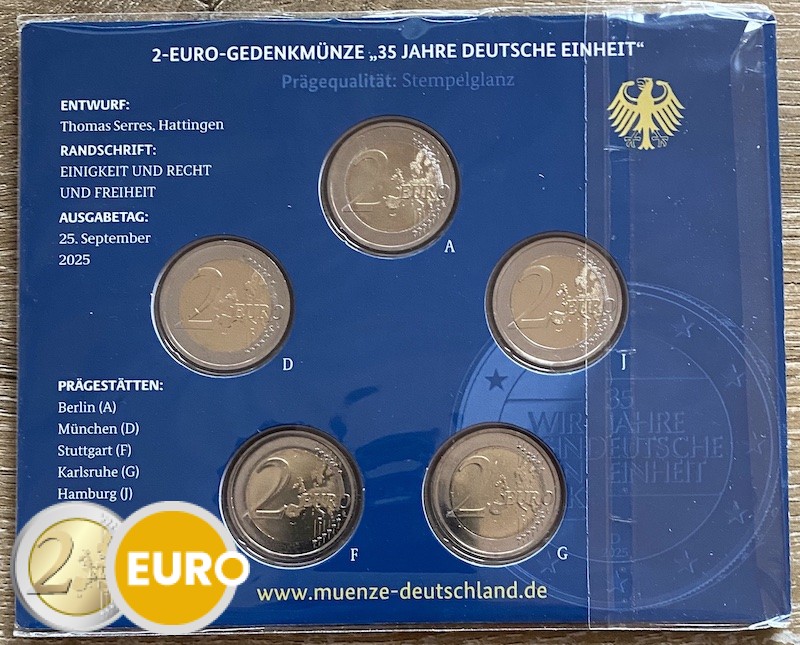 Diese 2 Euro Gedenkmünze feiert 35 Jahre deutsche Einheit. Seit der Wiedervereinigung im Jahr 1990 steht Deutschland für eine neue Ära des Friedens, der Freiheit und der Zusammenarbeit. Die Münze erinnert an dieses historische Ereignis und seine bleibende Bedeutung.
