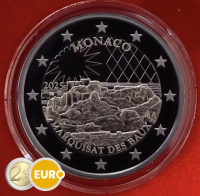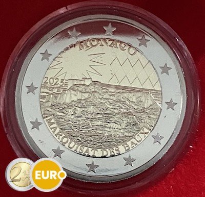 Heute wurde das Motiv der zweiten monegassischen 2-Euro-Gedenkmünze 2025 veröffentlicht. Das Thema der Münze 2025 lautet „Das alte Lehen der Familie Grimaldi: Baux“. Auf der Bildseite ist mittig der berühmte Felsen von Les Baux-de-Provence (Bouches-du-Rhône) in seinem heutigen Zustand und die Umgebung des Dorfes Les Baux de Provence dargestellt. Am oberen Bildrand ist der Ausgabestaat „MONACO“ vor gerautetem Schild rechterhand und dem Stern für Les Baux linkerhand zu sehen. Am unteren Bildrand sind der Ausgabeanlass „MARQUISAT DES BAUX“ dargestellt, das Ausgabejahr „2025“ sowie die Prägezeichen der Monnaie de Paris und des Generalgraveurs Joaquin Jimenez abgebildet. Auf dem äußeren Münzring sind die zwölf Sterne der Europaflagge dargestellt.