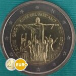 Au milieu de la pièce, il y a l’image du Christe sur le mont Corcovado. Il y a des enfants sur les escaliers avant. De gauche à droite, on peut retrouver le texte “XXVII GMG CITTA DEL VATICANO RIO 2013”. également à droit, il y a le lettre R pour la monnaie à Rome et le nom du créateur de l’image, Patrizio Daniele