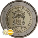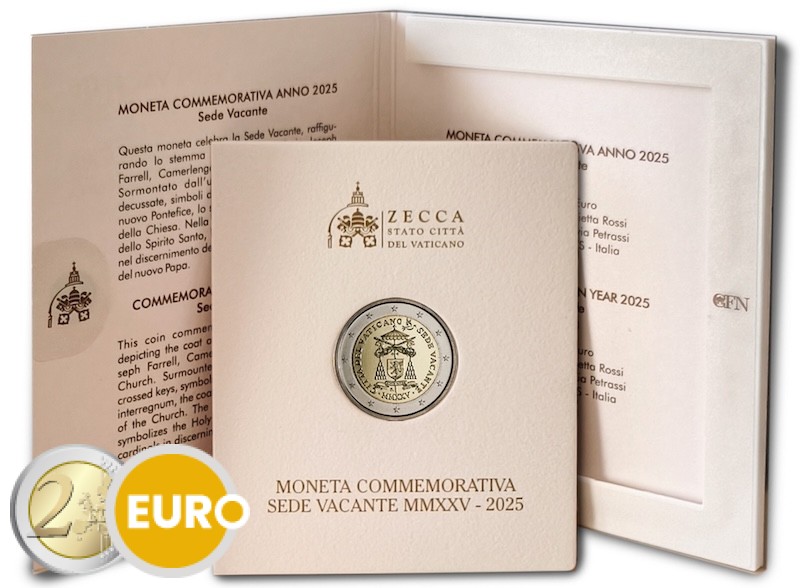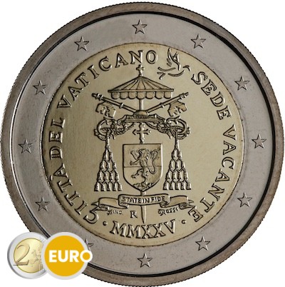 Armoiries du cardinal camérier, le cardinal Kevin Farrell, sous le symbole de la Chambre apostolique, représenté par deux clés croisées sous un parasol basilical. Sur le bord gauche figure l’État émetteur « CITTÀ DEL VATICANO », sur le bord droit l’occasion de l’émission « SEDE VACANTE » et en bas l’année en chiffres romains « MMXXV ». En haut à droite du motif, une colombe portant un rameau d’olivier interrompt l’inscription circulaire. Le différent monétaire « R » de l’atelier de Rome se trouve sous les armoiries du cardinal camérier, accompagné du nom du graveur à gauche et du sigle de la dessinatrice « O. ROSSI » à droite.